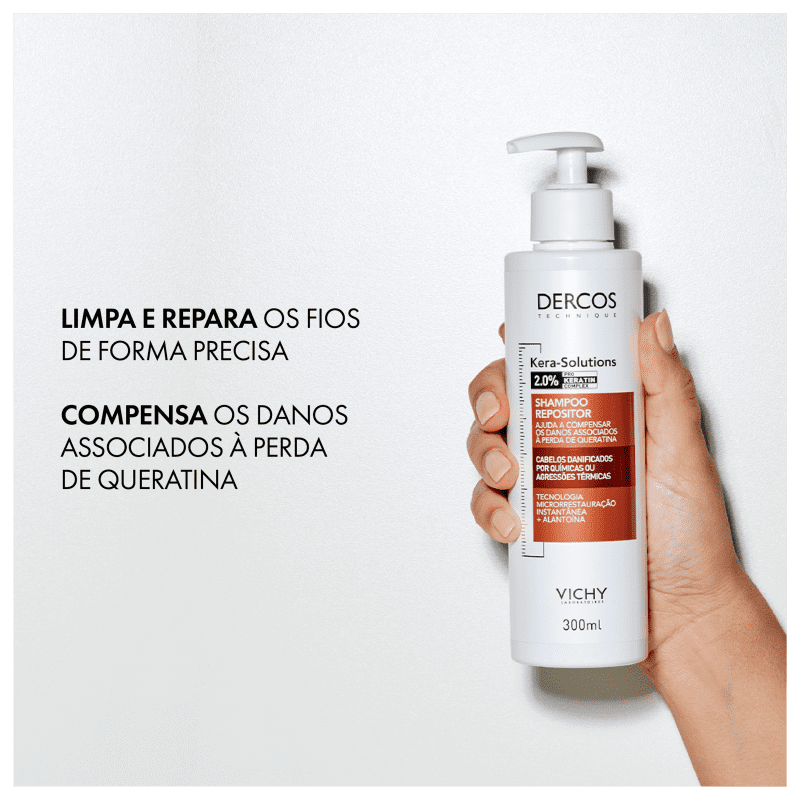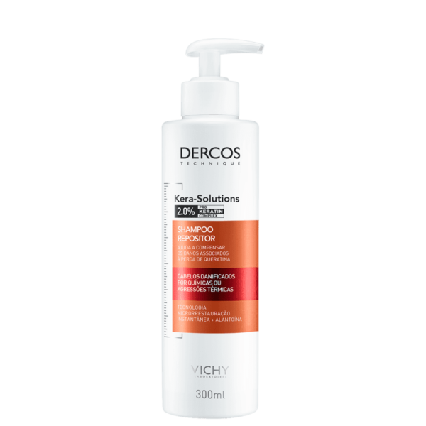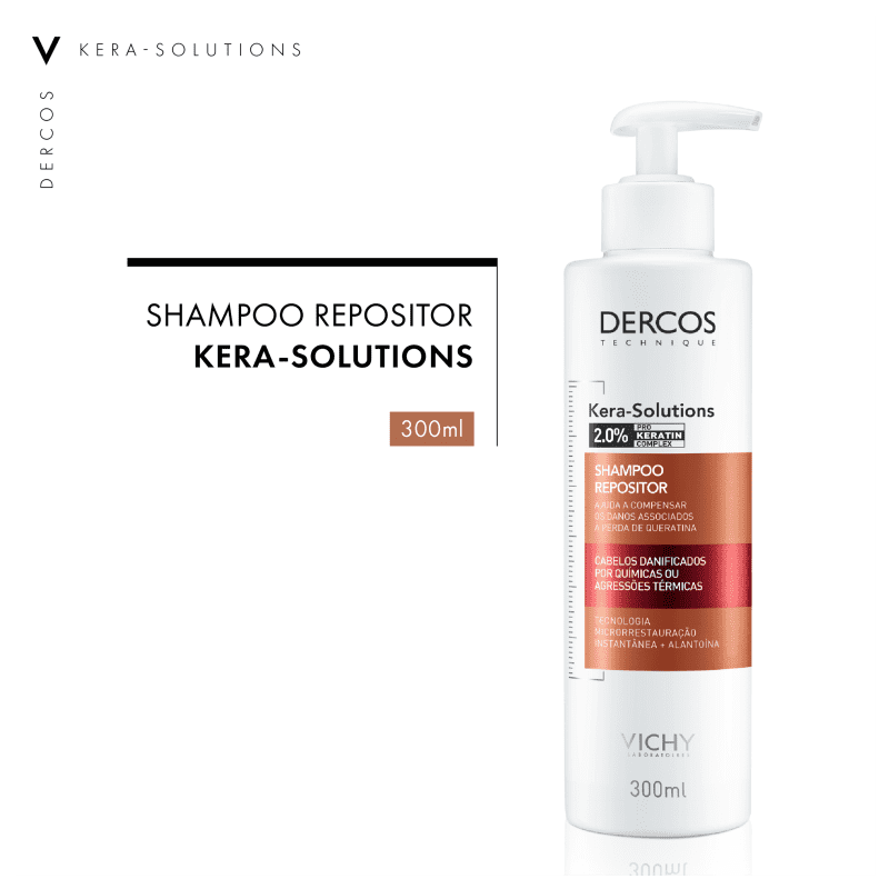 O Shampoo Dercos Kera-Solutions é indicado para cabelos danificados por químicas ou agressões térmicas (secador e chapinha). É um tratamento repositor de nutrientes, desenvolvido para compensar os danos associados à perda de queratina, reduzindo 63% dos danos nos fios no primeiro uso.